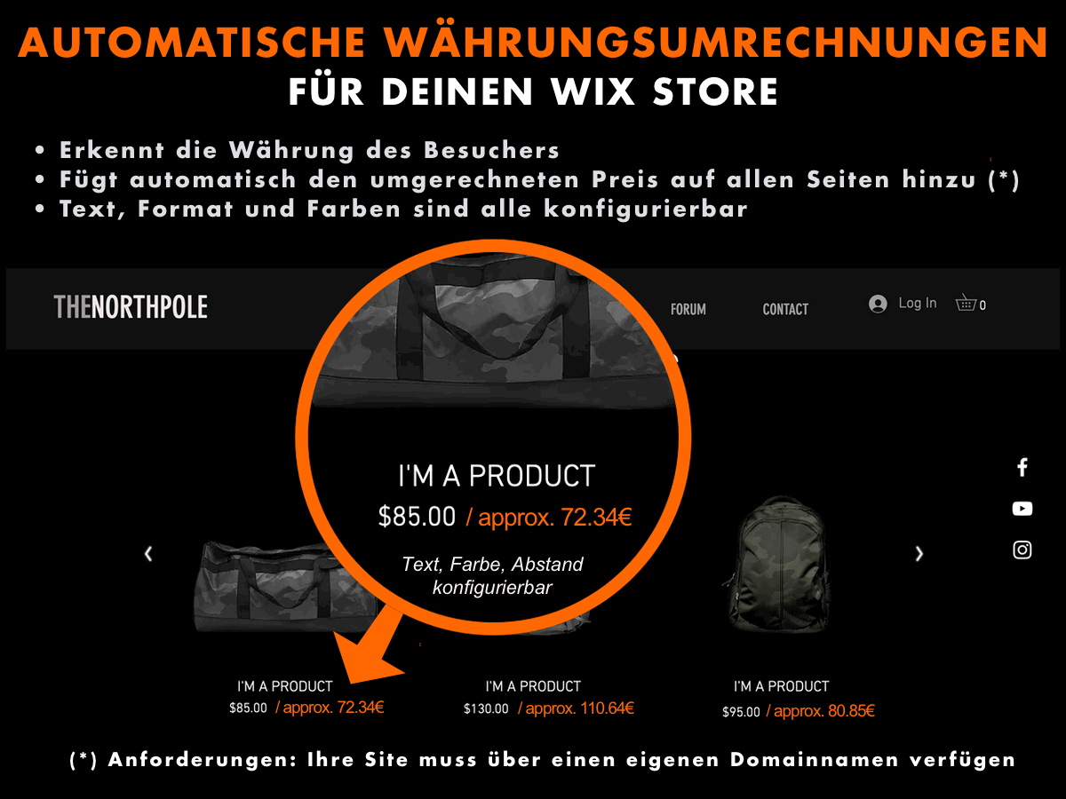 Vollautomatischer Modus: Erkennt die Währung Ihres Besuchers und fügt den lokalen Preis neben dem Originalpreis in einem Format Ihrer Wahl hinzu (damit diese Funktion funktioniert, ist Ihr eigener Domainname erforderlich)