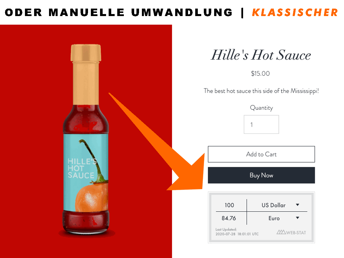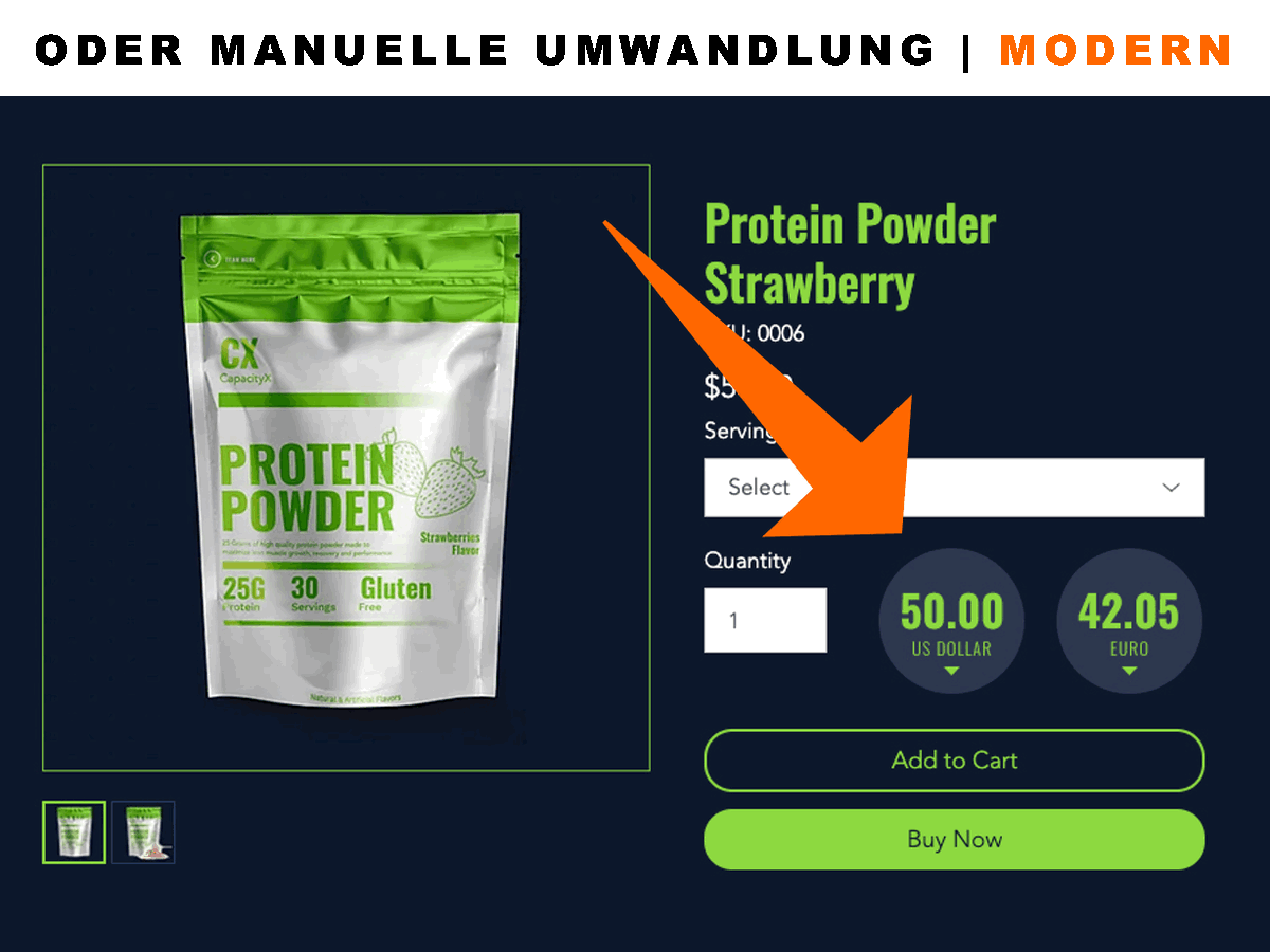 Oder manueller Modus: Fügen Sie den Konverter zu Ihren Produktseiten hinzu und ermöglichen Sie Ihren Besuchern die einfache Umrechnung Ihrer Preise in ihre lokale Währung.