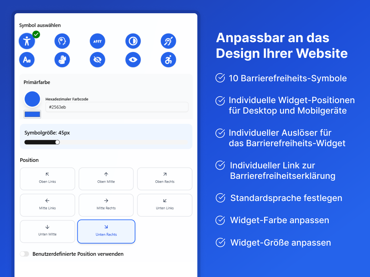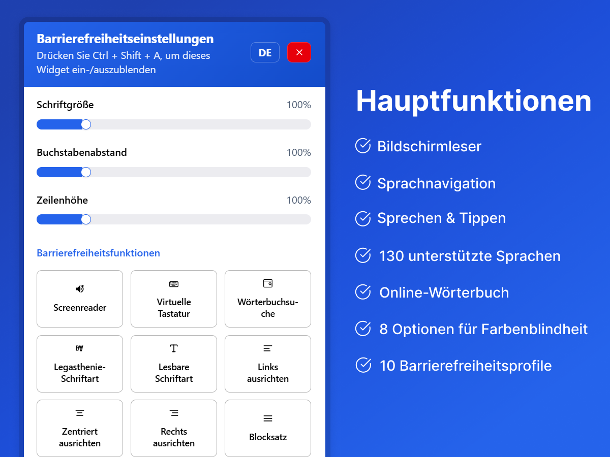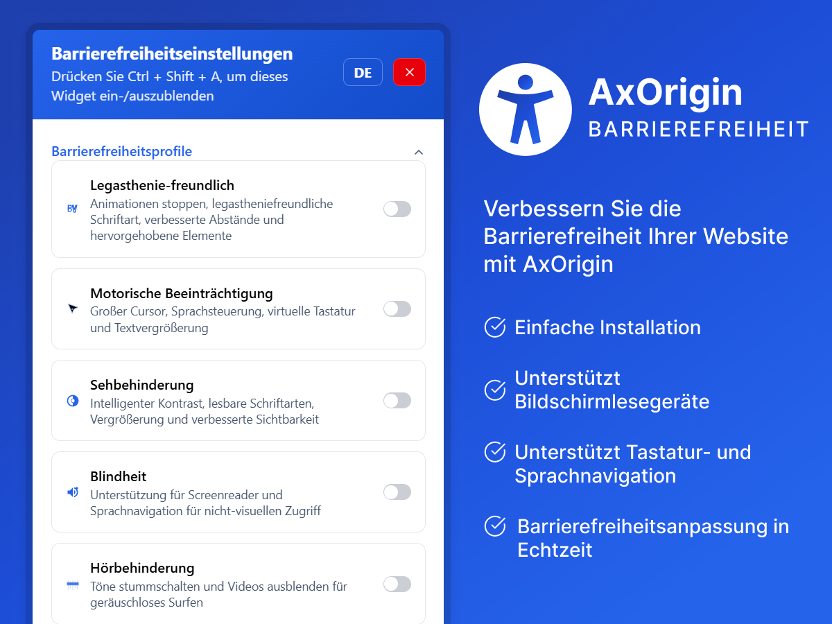 Das AxOrigin Barrierefreiheits-Widget ist ein KI-gestütztes Barrierefreiheits-Widget mit über 70 Funktionen und Unterstützung für 130 Sprachen. Zu den wichtigsten Funktionen gehören: Bildschirmleser, Sprechen & Tippen, Sprachnavigation, Online-Wörterbuch, virtuelle Tastatur, intelligenter Kontrast, 10 Barrierefreiheitsprofile, individuelle Widget-Farbanpassung, Tastaturkürzel, automatische Spracherkennung, individuelle Symbole, Positionen und ein individueller Link zur Barrierefreiheitserklärung