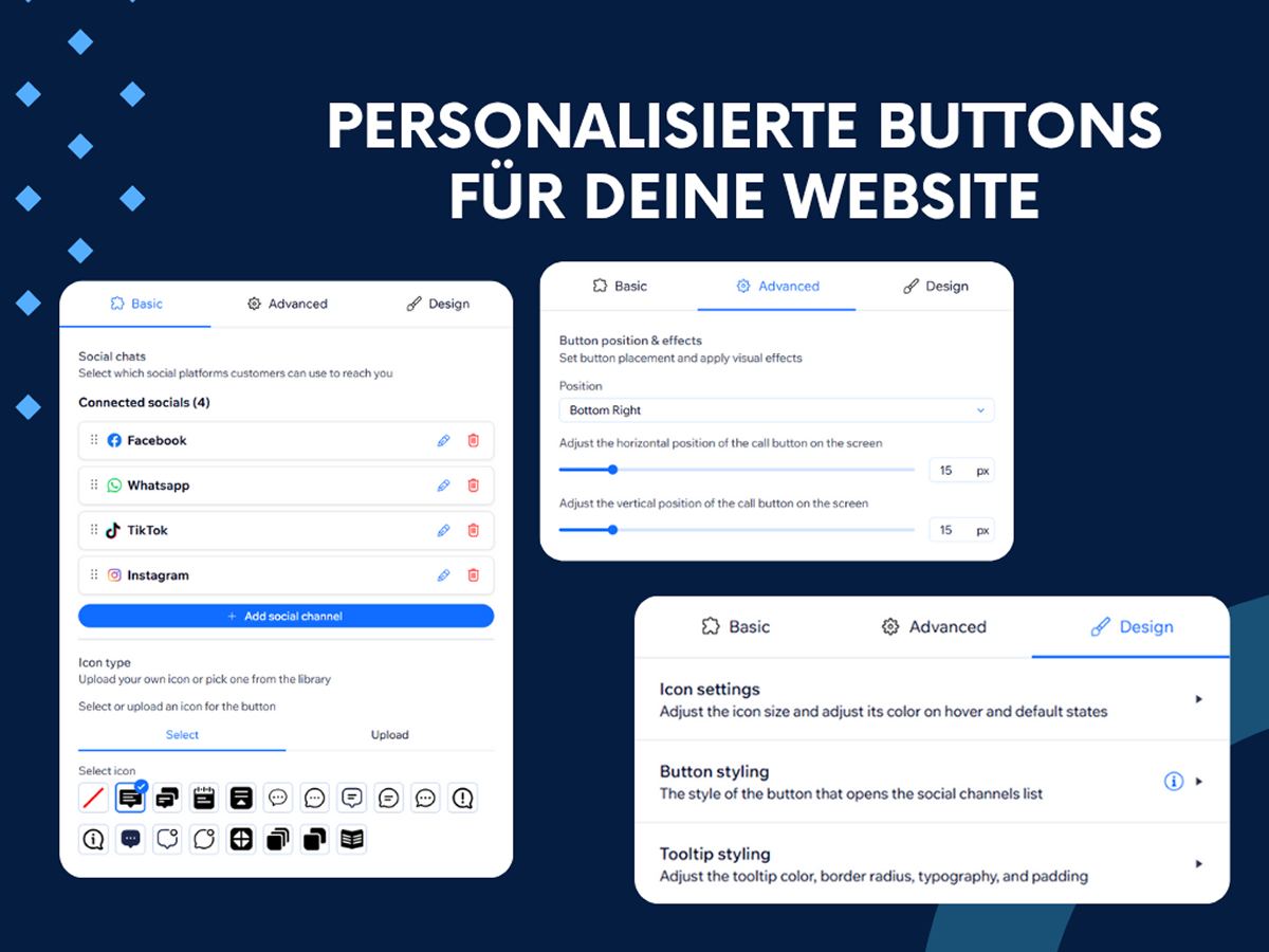 Passe die Buttons vollständig an – Farben, Symbole, Größen, Schriftarten und Position – um perfekt zu deiner Marke zu passen.
