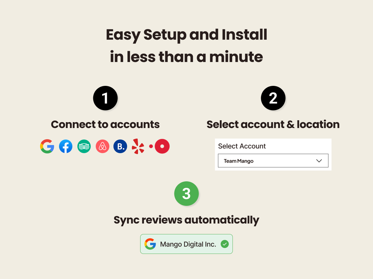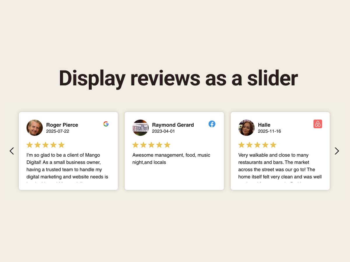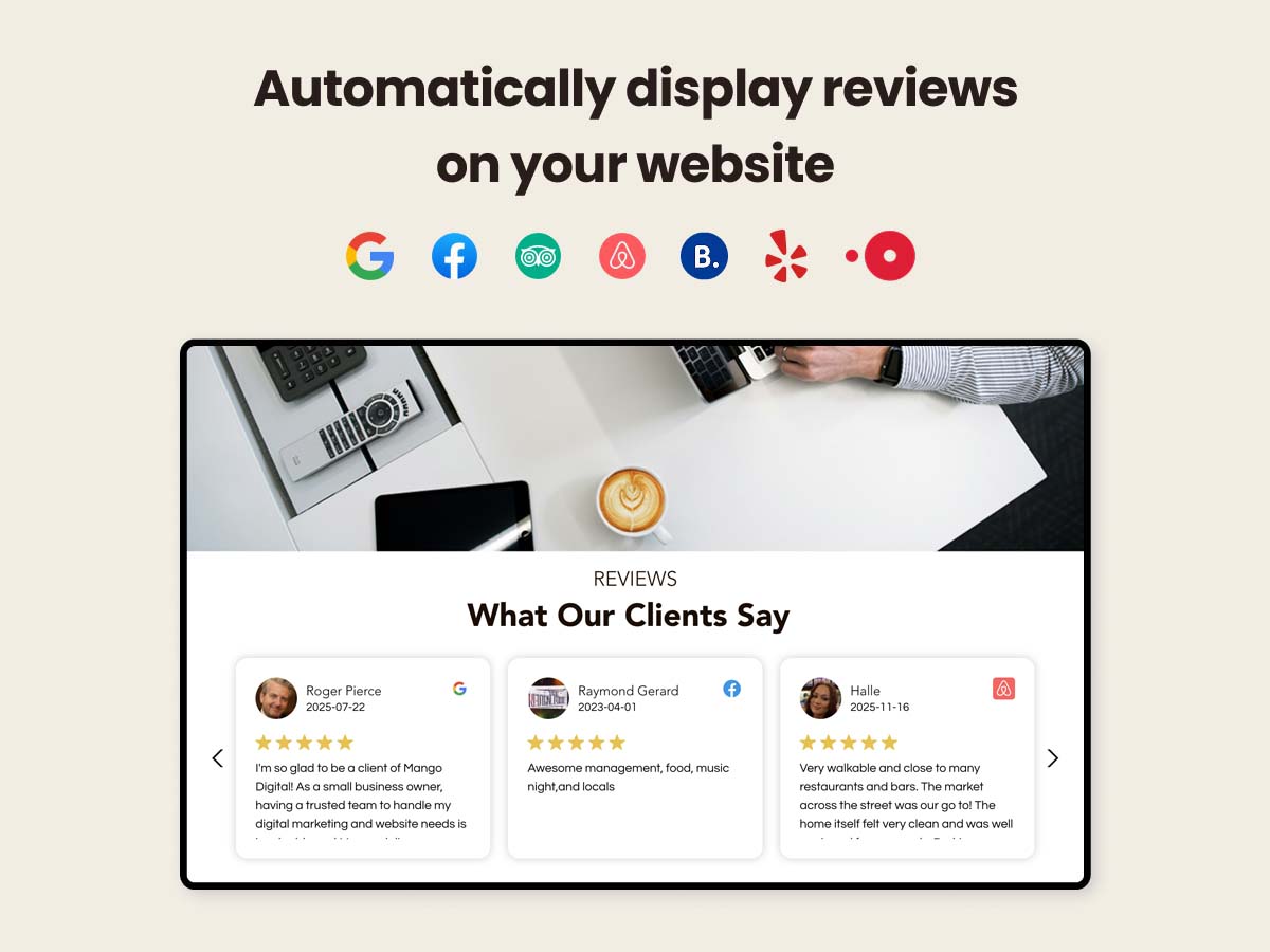 Effortlessly display and automatically sync Google, Facebook, Tripadvisor, OpenTable, Yelp, Airbnb, and Booking.com reviews, start displaying reviews on your website in minutes