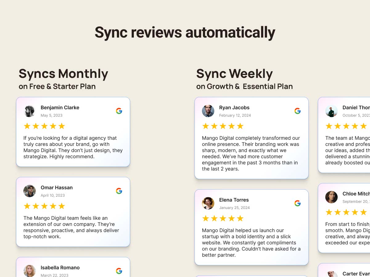Start free and display up to 5 reviews automatically. Upgrade anytime to unlock filtering out poor reviews, auto-looping, unlimited reviews, and more—plus save 20% on yearly plans.