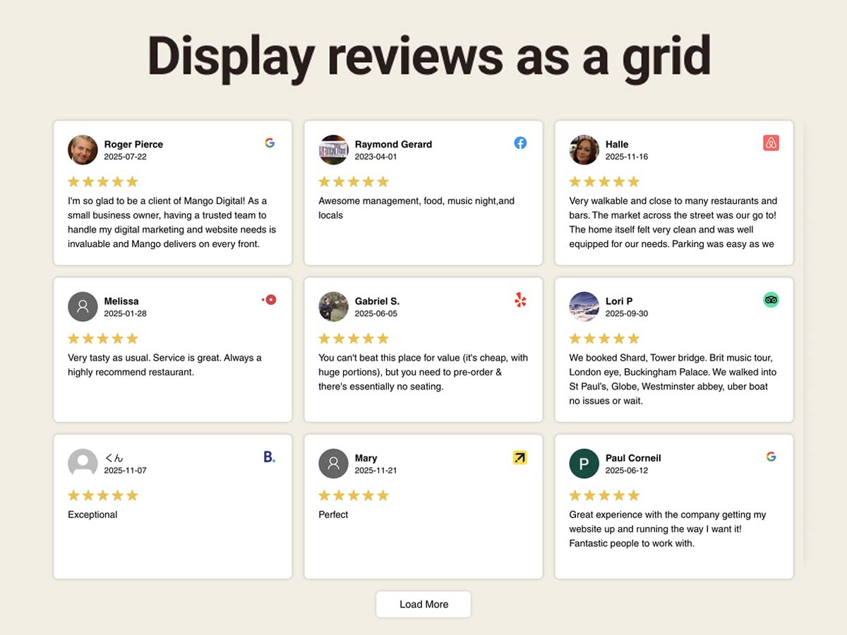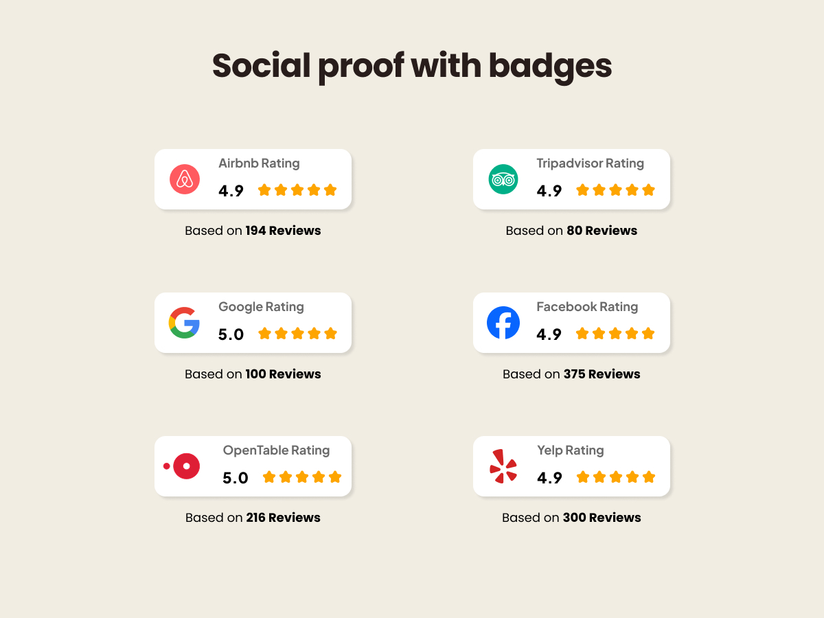 Grow your business and boost website conversions by displaying customer testimonials from Google, Facebook, Tripadvisor, OpenTable, Yelp, Airbnb, and Booking.com reviews. With customizable options and simple integration, it’s never been easier to leverage positive feedback to attract new customers and grow your business.