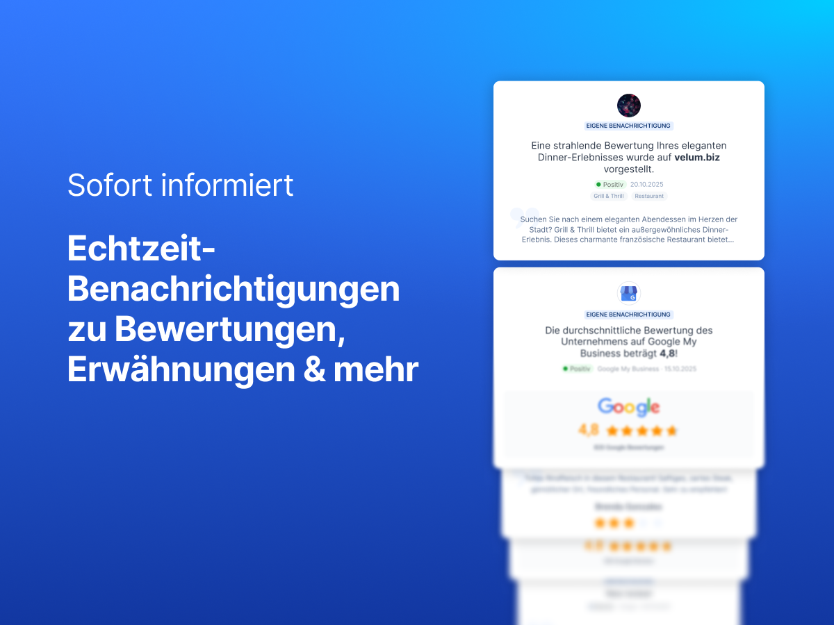 - Schütze deine Marke mit Echtzeit-Benachrichtigungen über Bewertungen & Erwähnungen.