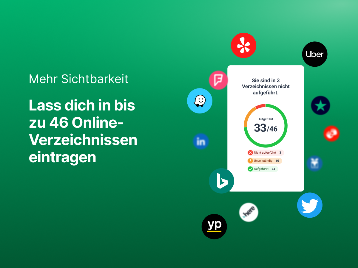 - Sei sofort auf Google, Facebook & über 30 Online-Verzeichnissen eingetragen.