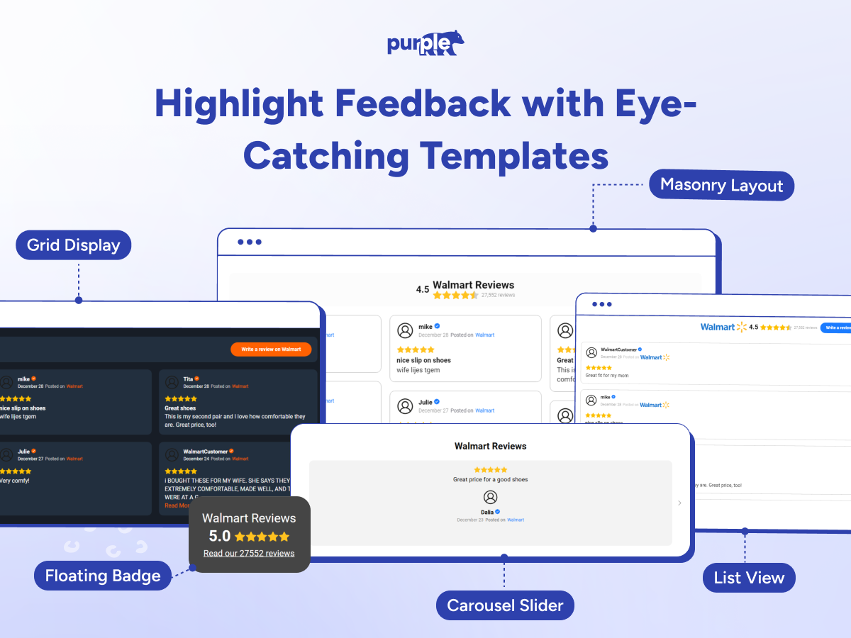 Flexible Layout-Optionen: Erstellen Sie professionelle Bewertungskarusells oder Listen, die professionelle Walmart-Bewertungen und Nutzer-Testimonials mit dieser leistungsstarken Bewertungs-App präsentieren.