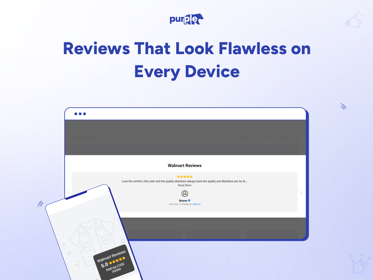 Integrieren Sie spielend leicht verifizierte Walmart-Bewertungen in Ihr Geschäft, um die Glaubwürdigkeit zu steigern und die Konvertierungen anzukurbeln. Importieren Sie Produktbewertungen direkt aus dem Walmart-Marktplatz mit einem einfachen Link oder ermöglichen Sie es den Kunden, ihr eigenes Feedback abzugeben. Wählen Sie aus verschiedenen Layouts wie Raster, Karussell oder Badges und passen Sie sie an das Design Ihres Geschäfts an.