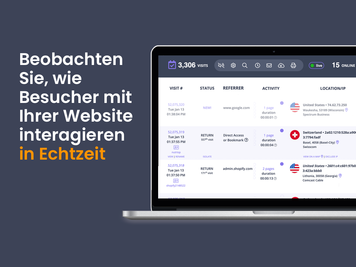 Live-Tracking von Besucherinteraktionen: Verfolgen Sie Besucher während ihres gesamten Aufenthalts in Echtzeit. Sehen Sie, wie sie durch Ihre Seiten navigieren, wo sie Zeit verbringen und wie sie mit Ihren Inhalten interagieren — genau in dem Moment, in dem es passiert.