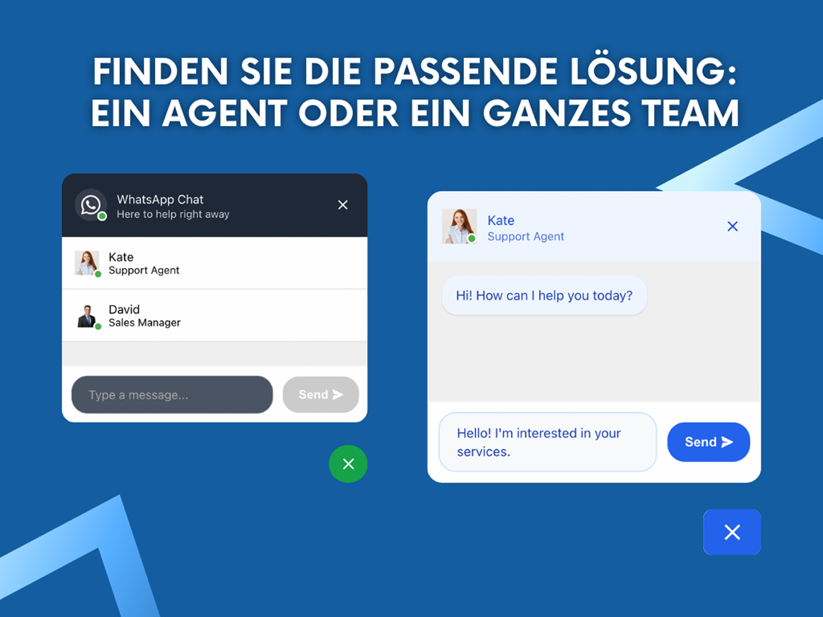 Bieten Sie schnellen Kundensupport mit mehreren Kontaktoptionen und ermöglichen Sie es Besuchern, direkt den passenden Teammitarbeiter zu erreichen. Steigern Sie das Engagement, erhöhen Sie die Conversion-Rate und bleiben Sie mit Ihren Kunden über ihre bevorzugte Messaging-App in Verbindung.