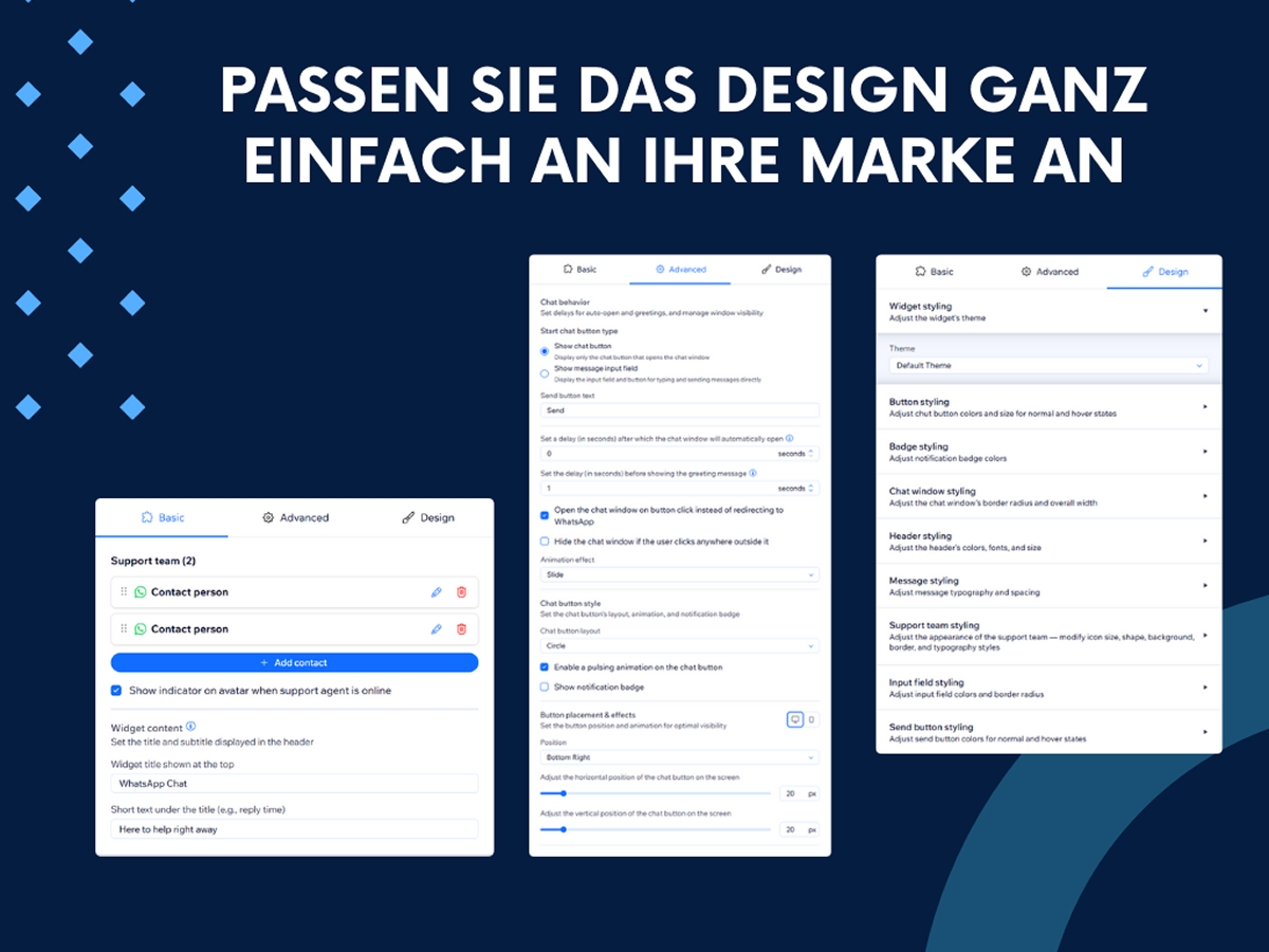 Passen Sie Farben, Texte und Icons ganz einfach an Ihre Marke an und schaffen Sie ein nahtloses Live-Chat-Erlebnis. Ob Fragen beantworten, Kaufentscheidungen unterstützen oder Echtzeit-Support bieten – WhatsApp Chat hilft Ihnen, stärkere Kundenbeziehungen aufzubauen und Besucher in loyale Kunden zu verwandeln.